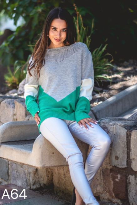 A64 - Sweater Cuello Bote Tricolor con Calado en el Cuello