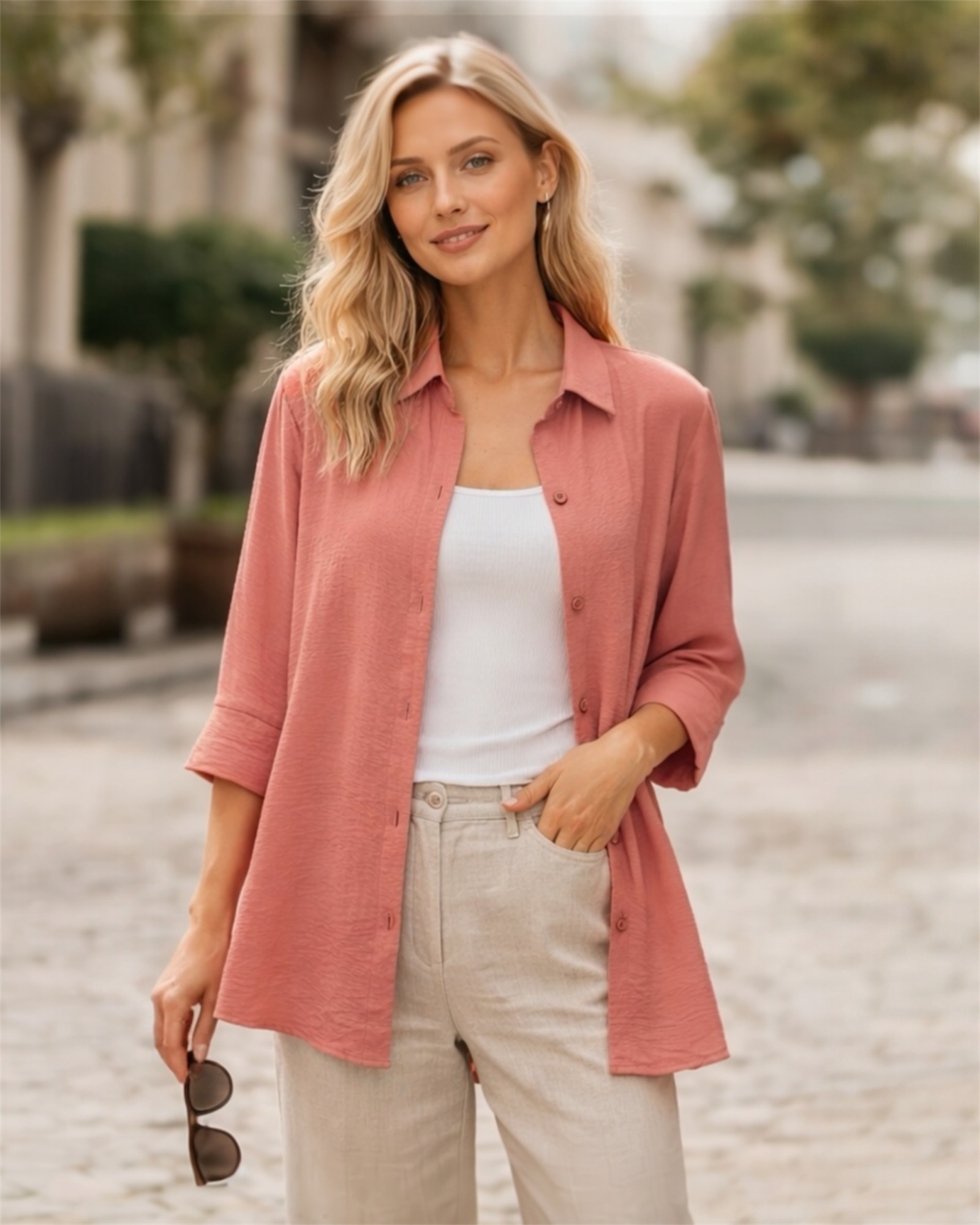 Blusa manga larga cuello camisero perfecta para un look casual con estilo en cualquier ocasión.